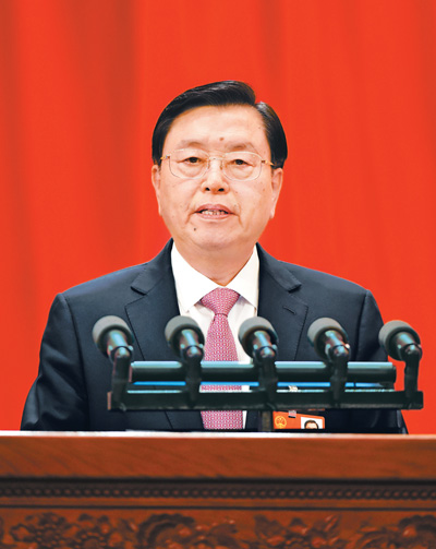 受十二届全国人大常委会委托,张德江向大会作全国人大常委会工作报告。他说,过去的五年,是我们党和国家发展进程中极不平凡的五年。在以习近平同志为核心的党中央坚强领导下,十二届全国人大常委会全面贯彻落实党的十八大和十九大精神,深入学习贯彻习近平新时代中国特色社会主义思想,坚定坚持党的领导、人民当家作主、依法治国有机统一,坚决维护习近平总书记权威和核心地位,坚决维护以习近平同志为核心的党中央权威和集中统一领导,认真履行宪法法律赋予的职责,全面开创人大工作新局面,人民代表大会制度理论和实践创新取得重大成就,社会主义民主法治建设迈出重大步伐。