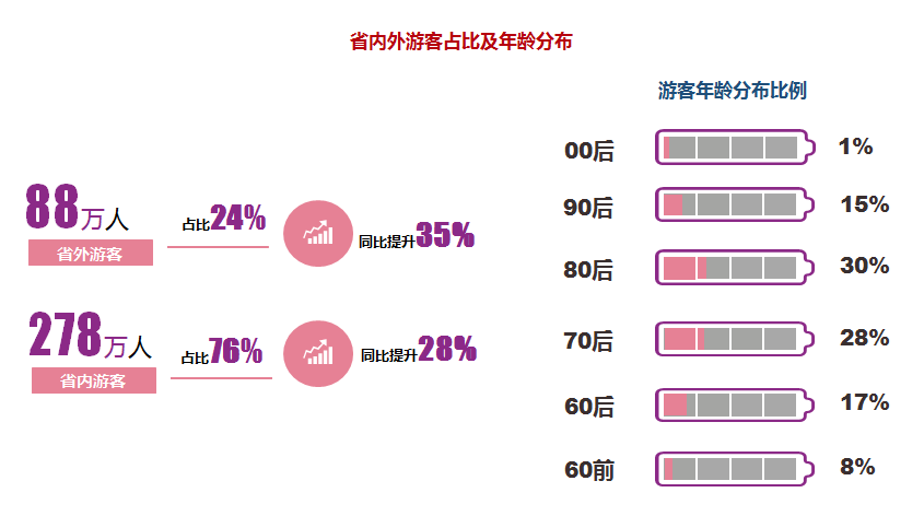 省内游以省内游客为主,占比达76%,较去年同比提升28%,省外游客也较去年同比提升35%,这说明大家在繁忙的工作之余,假期选择旅游放松身心的人越来越多。
