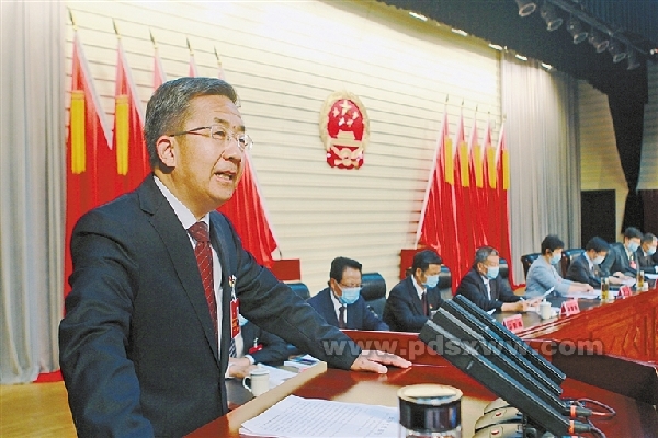 5月12日,平顶山市第十一届人民代表大会第三次会议在市行政服务综合楼一楼会议室开幕。图为市长张雷明作政府工作报告。 本报记者 牛智广摄