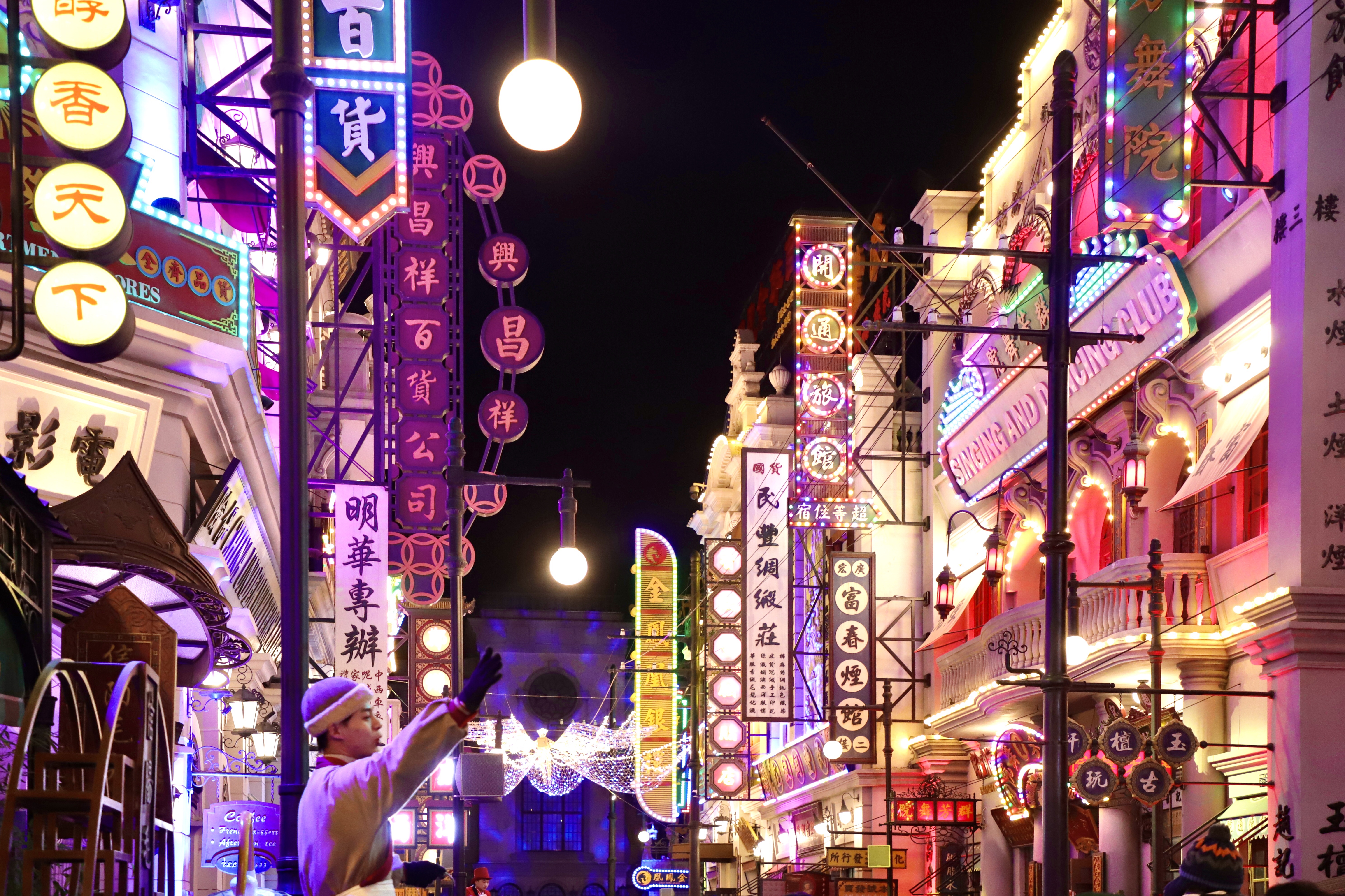 12月29日,大河网记者来到建业华谊兄弟电影小镇, 沿着电影小镇街道中央的电车轨道漫步,身着旗袍礼服的“市民”与你擦肩而过,小商小贩的叫卖声此起彼伏,黄包车的叮叮当当萦绕耳畔……走过这一段上世纪的街道,世界大剧院矗立在眼前。