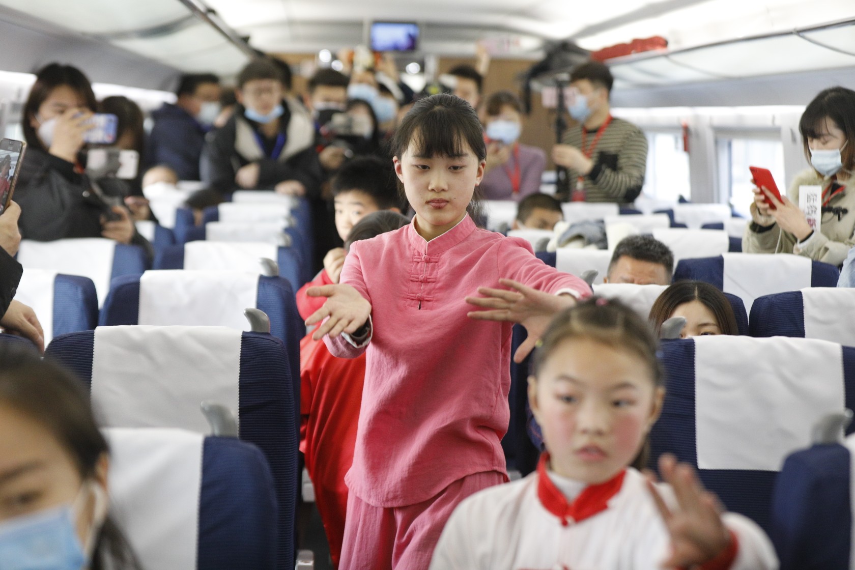 焦作站小演员们在车厢里表演太极拳