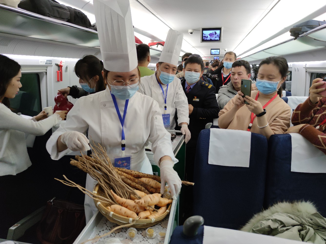 在焦作站,口感绵密的山药饮料、做成太极图案的山药泥甜品、嚼劲十足的枣花馍干……焦作美食也都抓住机会做推广。