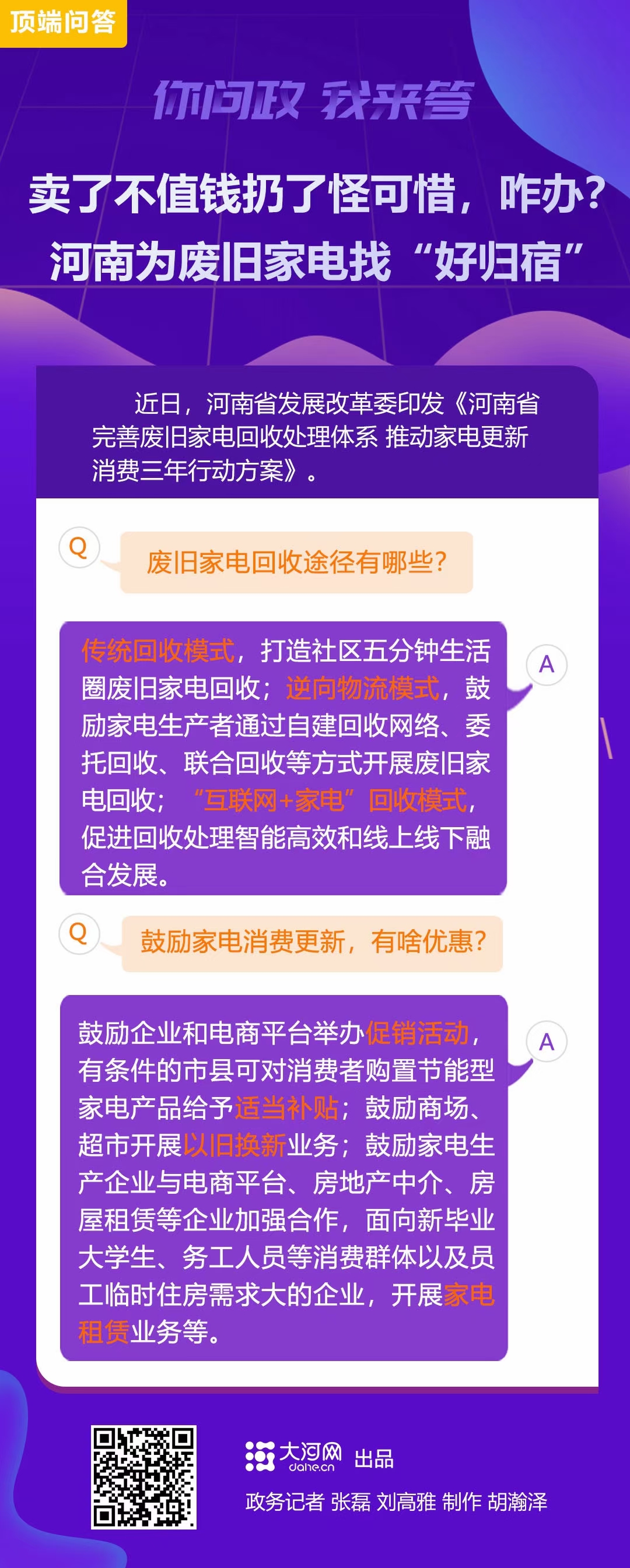 大河网讯 (政务记者 刘高雅)2月19日,记者从河南省发展改革委获悉,为完善废旧家电回收处理体系,推动家电更新消费,省发展和改革委员会、省工业和信息化厅、省财政厅等8部门联合印发《关于组织开展河南省废旧家电回收处理体系建设试点工作的通知》(以下简称《通知》),《通知》提出,要确定一批试点县区和企业,开展废旧家电回收处理体系试点建设。