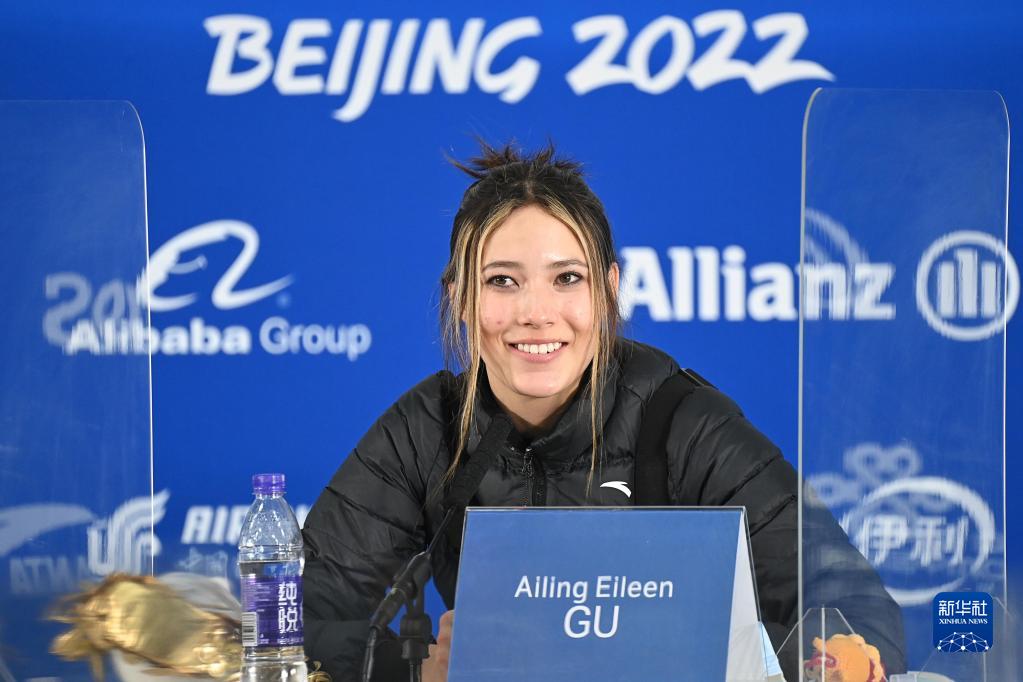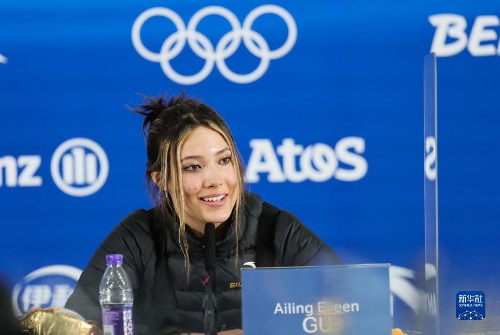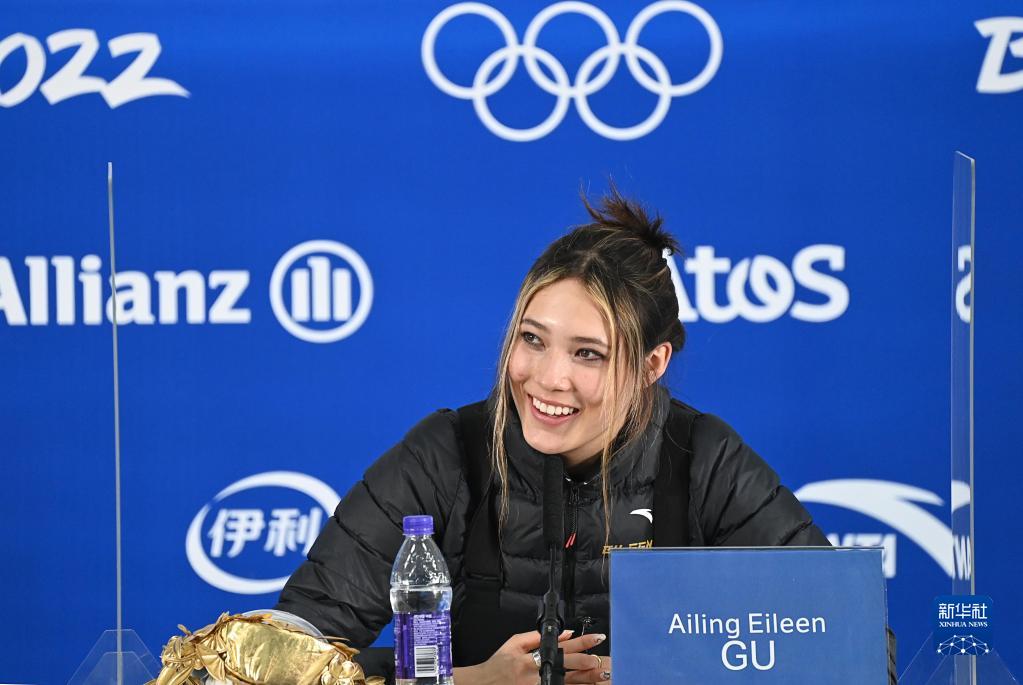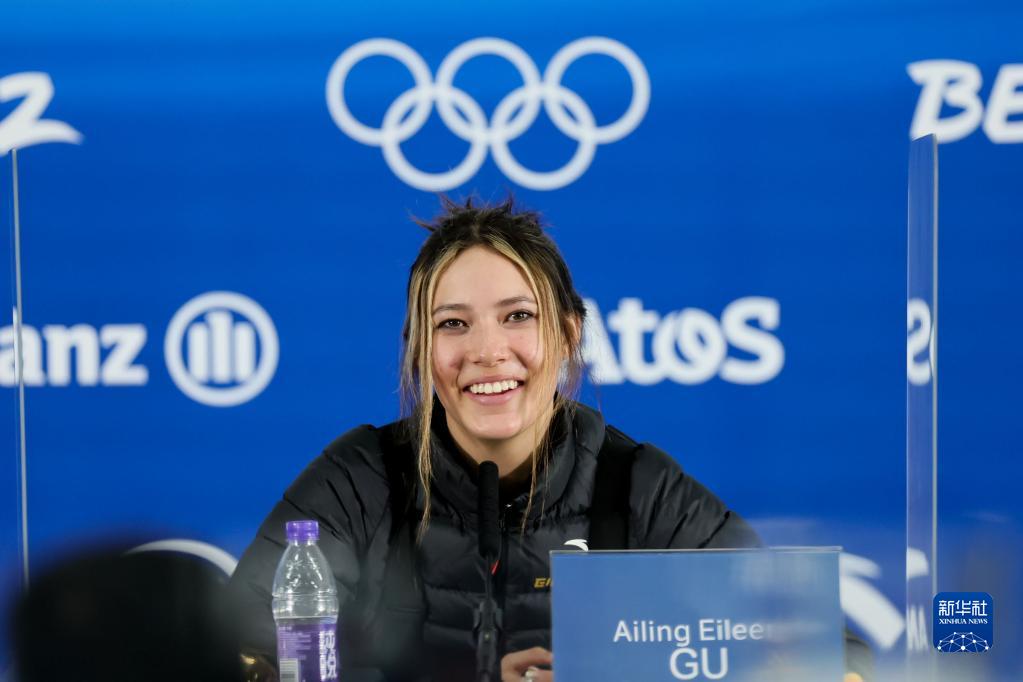 2月8日,中国选手谷爱凌在赛后新闻发布会上。