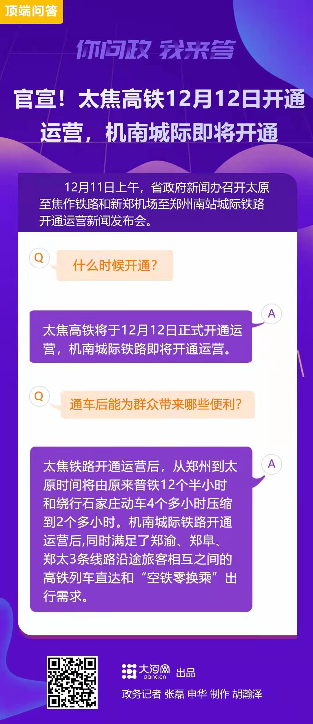 大河网讯 (政务记者 申华)备受关注的太原至焦作高速铁路、新郑机场至郑州南站城际铁路即将开通运营! 12月11日,河南省政府新闻办召开太焦铁路和新郑机场至郑州南站城际铁路开通运营新闻发布会。通报两条铁路项目建设情况,介绍开通运营准备及车次安排等情况。
