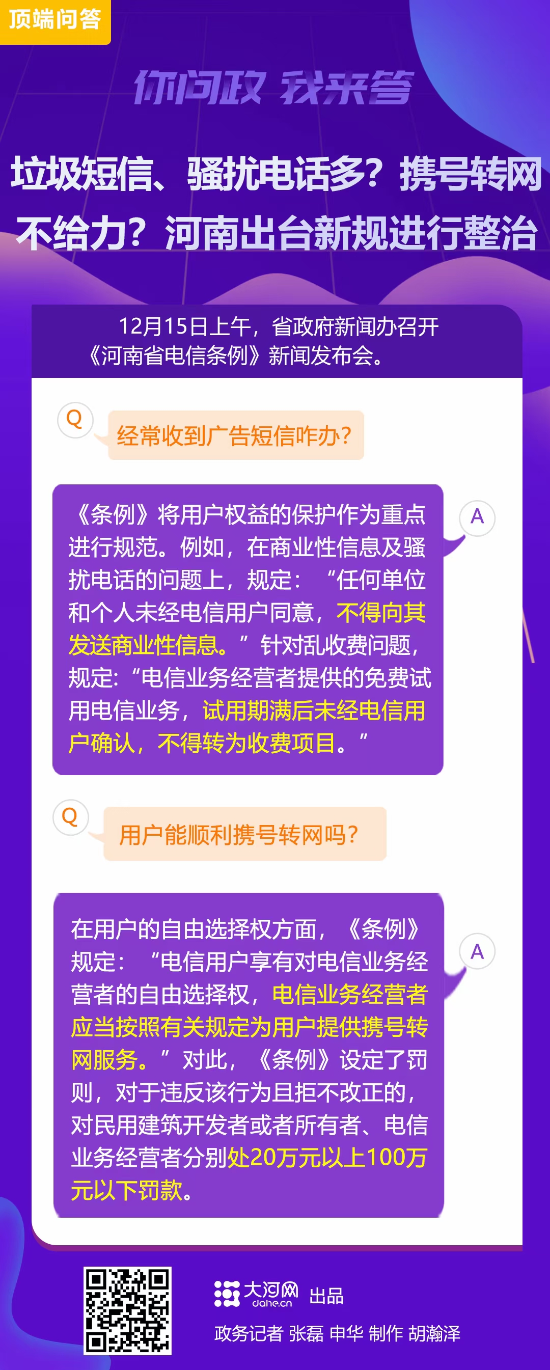 大河网讯(政务记者 申华)电信市场乱收费、多收费?隔三差五垃圾短信、骚扰电话影响工作、生活?携号转网服务不给力?……这些问题将得到有效解决!《河南省电信条例》将于2021年1月1日起施行。12月15日,河南省政府新闻办召开新闻发布会,介绍《河南省电信条例》(以下简称《条例》)制定的背景和过程以及主要内容,并回答记者提问。