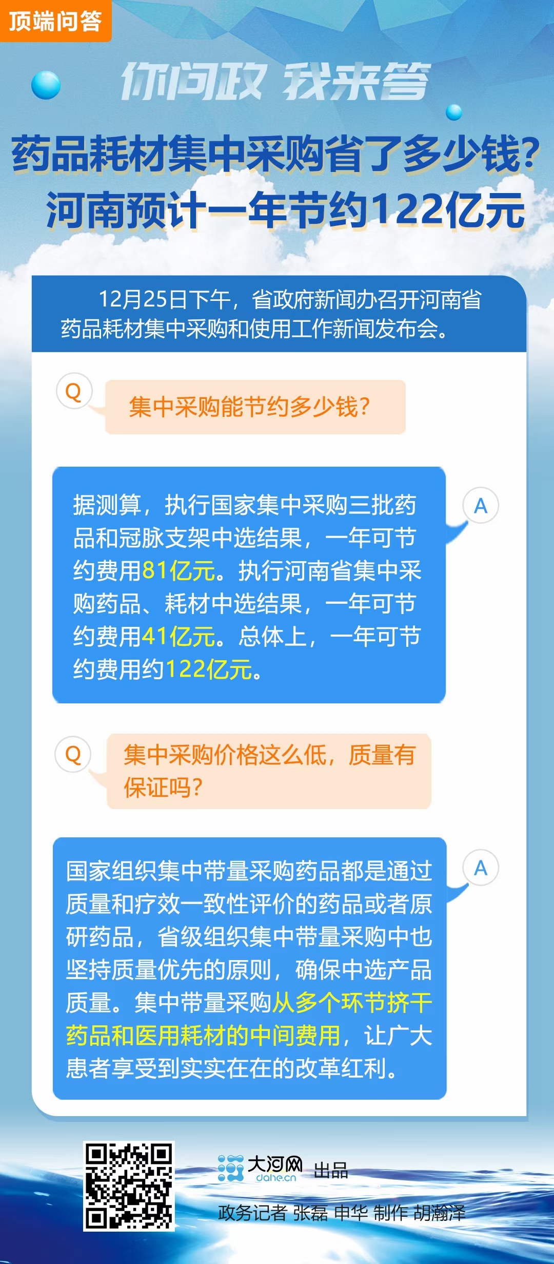 医药价格的降低,给群众带来了看得见、摸得着的实惠。据测算,执行国家集中采购三批药品和冠脉支架中选结果,一年可节约费用81亿元。执行河南省集中采购药品、耗材中选结果,一年可节约费用41亿元。总体上,执行国家和我省集中采购结果后,集中采购药品和耗材一年费用将由155亿元降至33亿元,一年可节约费用约122亿元。