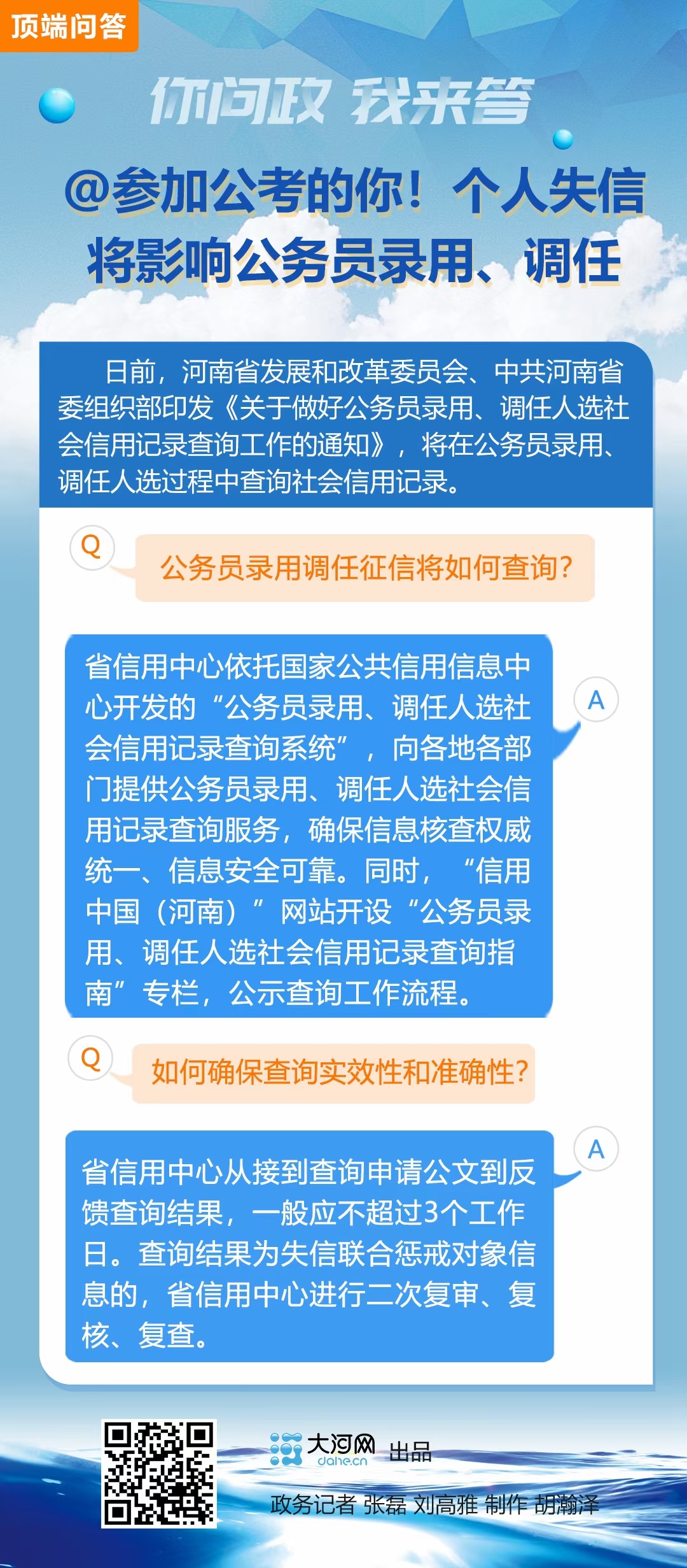 河南省发展改革委相关负责人表示,查询公务员录用、调任人选社会信用记录既是贯彻落实《公务员法》等法律规范要求的具体举措,也是加强政务诚信建设、提升公务员队伍信用整体水平的关键手段。各级各部门要高度重视,精心组织,强化责任意识和规则意识,以高度的政治责任感严格制度、严格责任、严格程序,严肃认真开展查询工作。