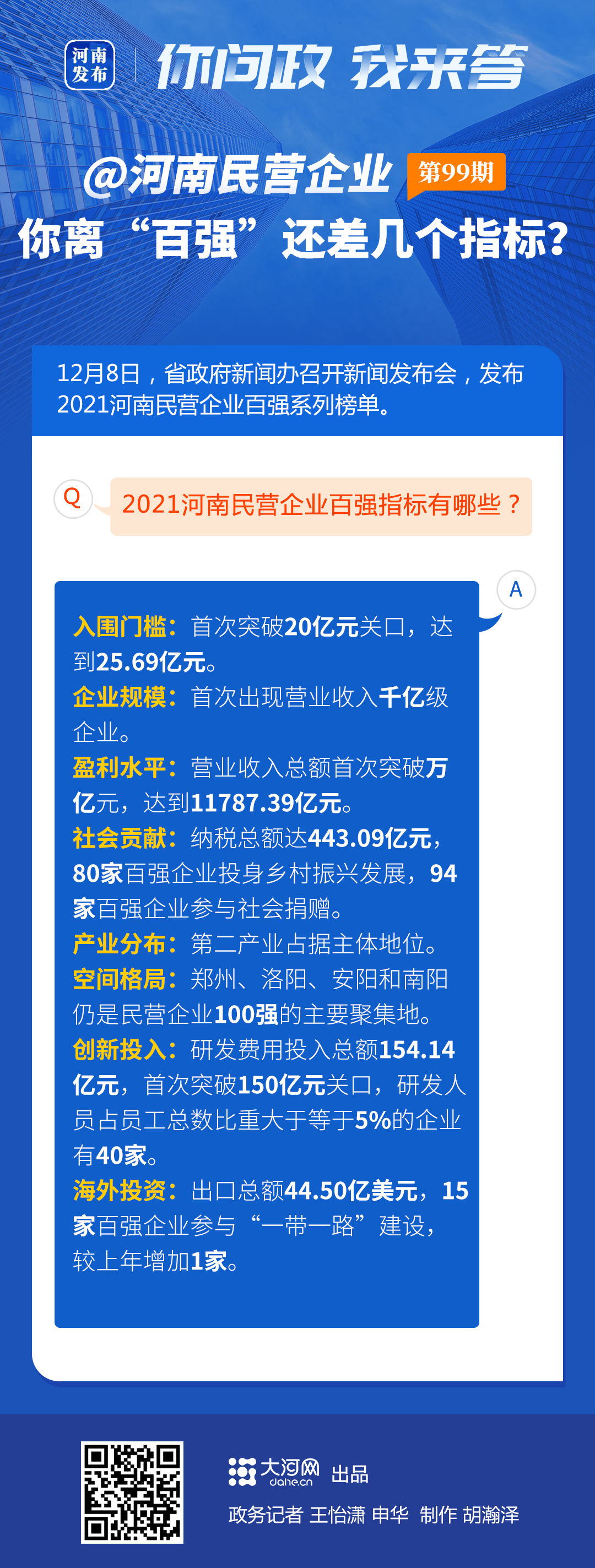 大河网讯 (政务记者 王怡潇 申华/文 胡瀚泽/制图)12月8日,河南省政府新闻办召开新闻发布会,发布2021河南民营企业百强系列榜单和相关内容。大河网记者对发布会内容进行解读,推出第99期“你问政我来答”。