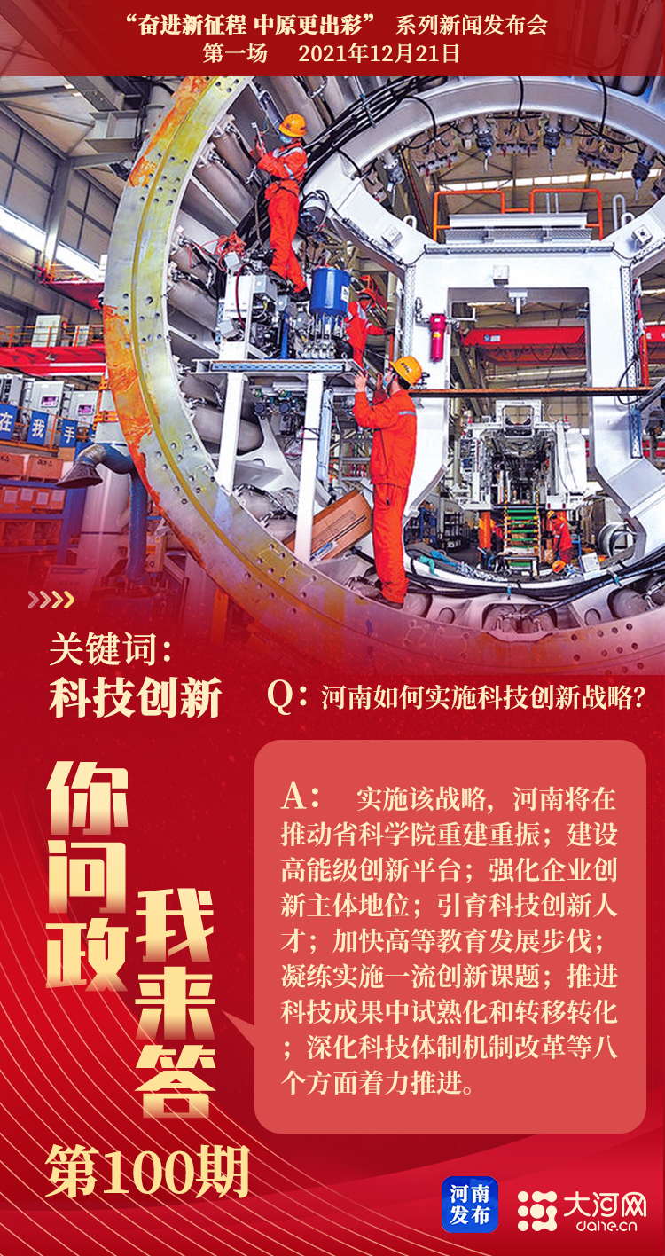 大河网讯 (政务记者 王怡潇 申华/文 赵原歌/制图)12月21日,省委宣传部举行“奋进新征程 中原更出彩”系列第一场新闻发布会,介绍河南省实施“实施创新驱动、科教兴省、人才强省战略”的目标任务和具体举措。大河网记者对发布会内容进行解读,“你问政我来答”栏目推出第100期——科技创新。