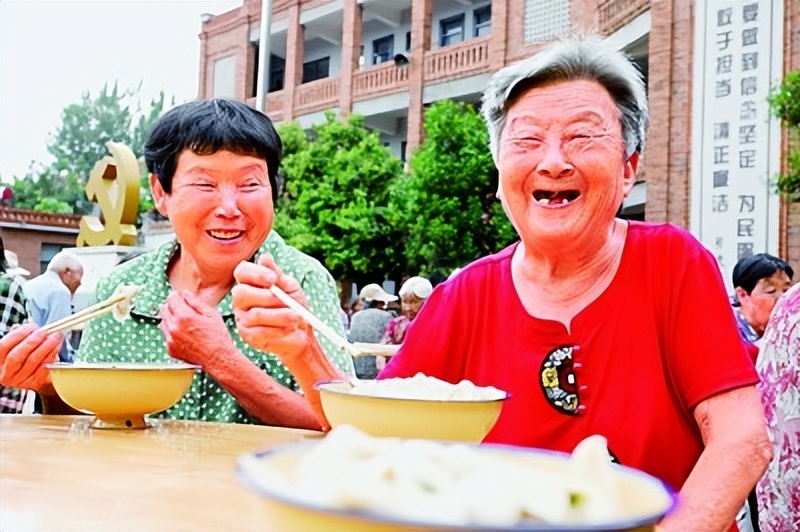 在兰考县东坝头镇张庄村举办的饺子宴上,老人乐开花。