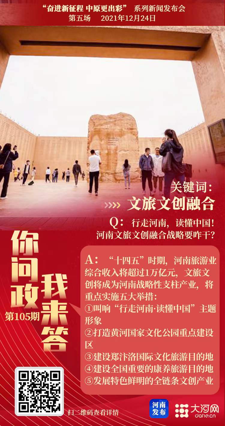 大河网讯 (政务记者 王怡潇 申华/文 赵原歌/制图)12月24日,省委宣传部举行“奋进新征程 中原更出彩”系列第五场新闻发布会,介绍河南省实施文旅文创融合战略的目标任务和具体举措。大河网记者对发布会内容进行解读,“你问政我来答”栏目推出第105期——文旅文创融合。