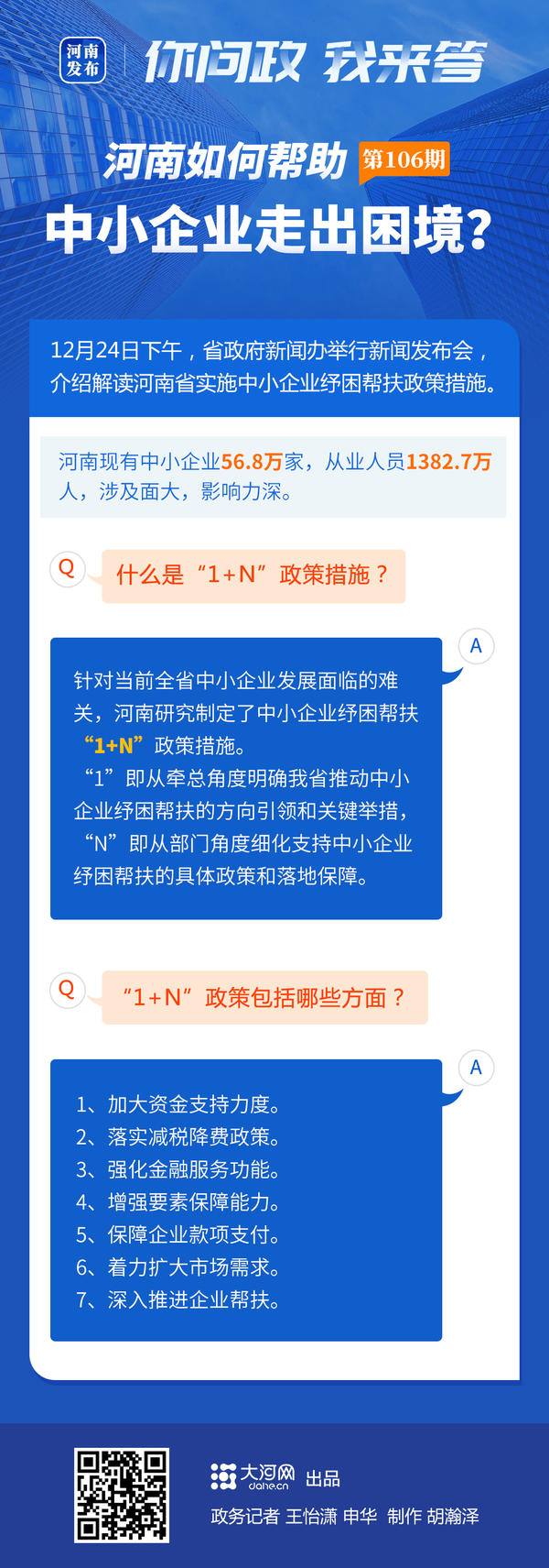 大河网讯 (政务记者 王怡潇 申华/文 胡瀚泽/制图)中小企业是市场的主体,是经济社会发展的主力军。12月24日下午,省政府新闻办举行新闻发布会,介绍并解读河南省实施中小企业纾困帮扶政策措施。“你问政我来答”栏目推出第106期,对发布会内容进行解读。