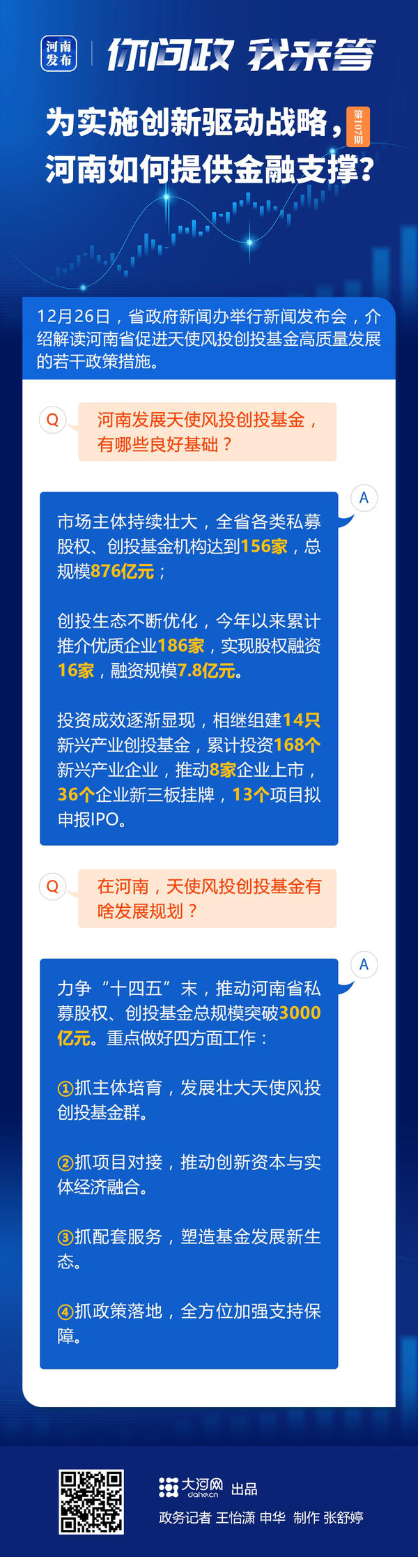 大河网讯 (政务记者 王怡潇 申华/文 张舒婷/制图)12月26日,省政府新闻办举行新闻发布会,介绍解读河南省促进天使风投创投基金高质量发展的若干政策措施。“你问政我来答”栏目推出第107期,对发布会内容进行解读。