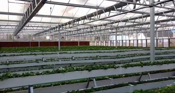 1月14日,河南省镇平县老庄镇小西岗村智能阳光玻璃温室大棚内,一颗颗娇嫩欲滴的草莓镶嵌在绿叶间,鲜红饱满。