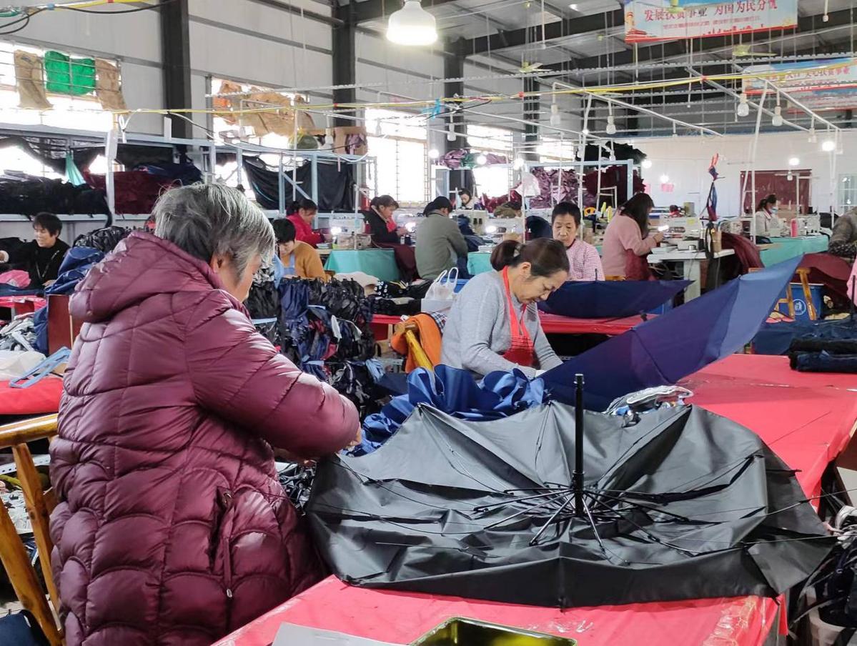 新年的假日气氛还未完全消褪,在雨伞生产车间,工人们已经按照各自分工,忙着缝合伞面、组装伞架、固定面架,虽然忙碌但眉宇间却流露着劳动的充实和收获的喜悦。