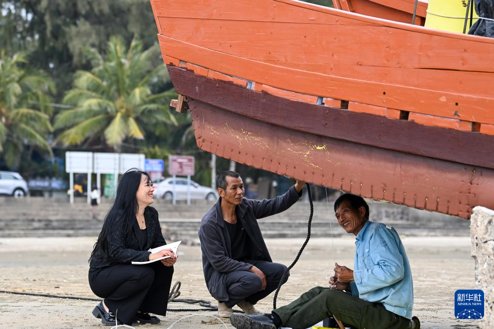 2月7日,在广西东兴市,苏海珍(左)与当地渔民交流,了解他们的期盼。