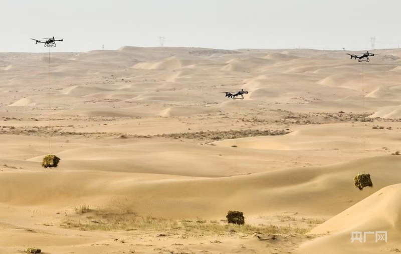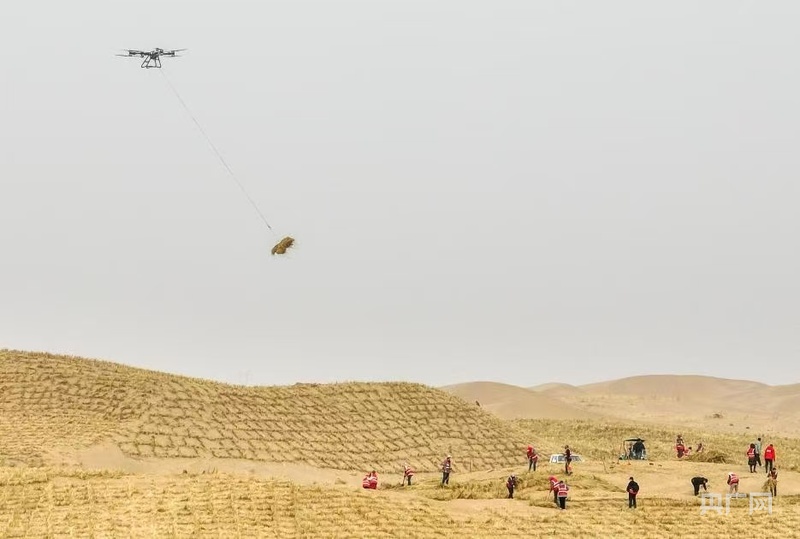 2月28日,无人机在内蒙古阿拉善盟境内的乌兰布和沙漠运送草料(央广网发 贝赫 摄)