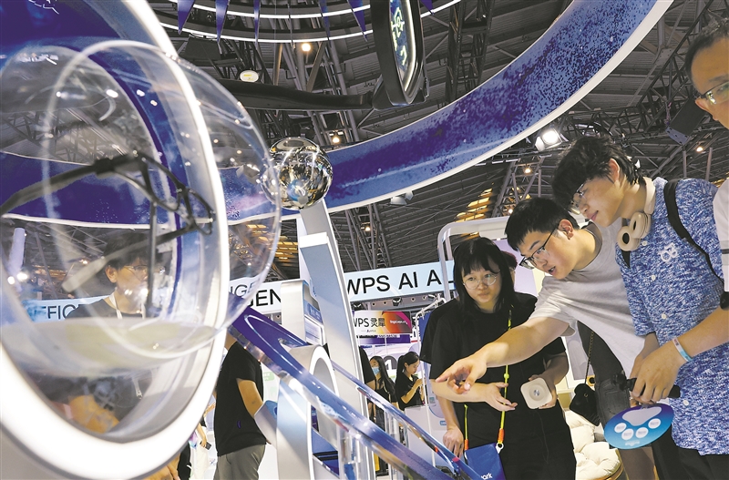 参观者在2025世界人工智能大会现场的一个智能眼镜展台前交流讨论。