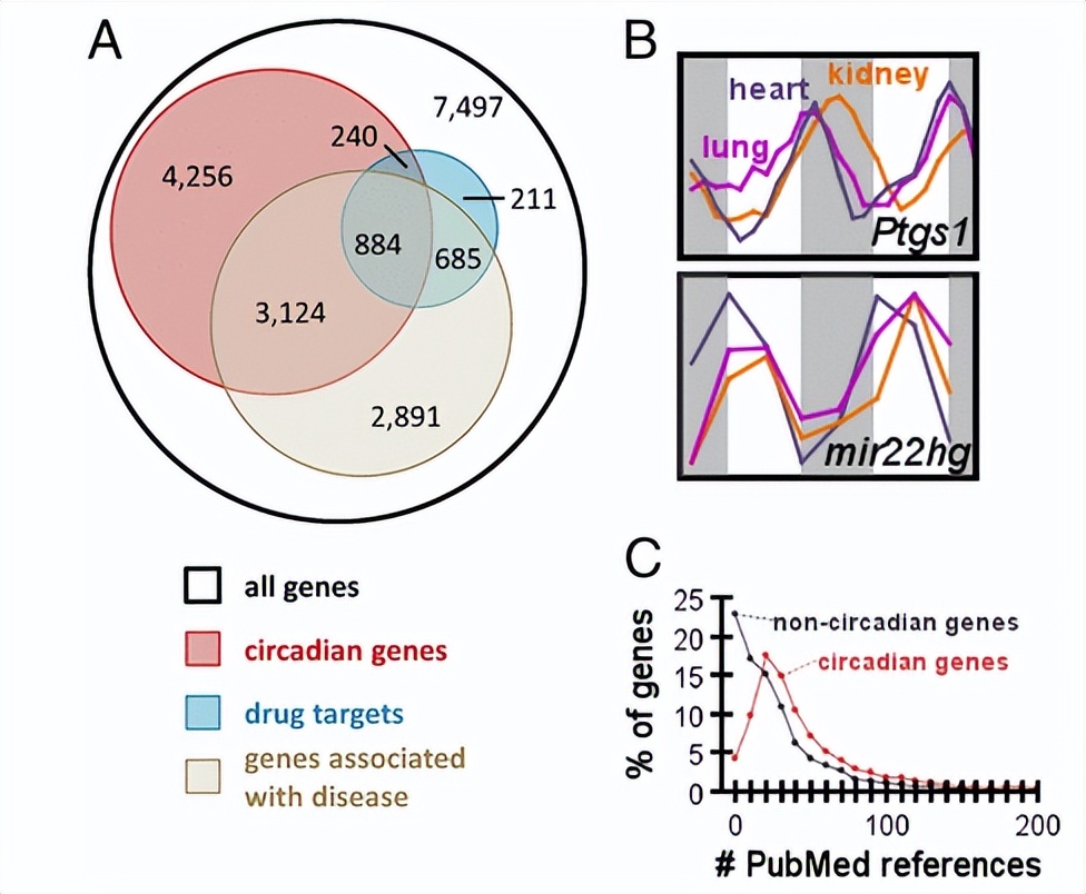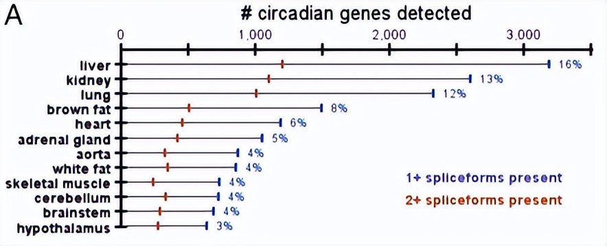 这是不同组织中节律基因表达的研究。这是这些基因的示意图。当然了,一些药物也会引发节律的改变