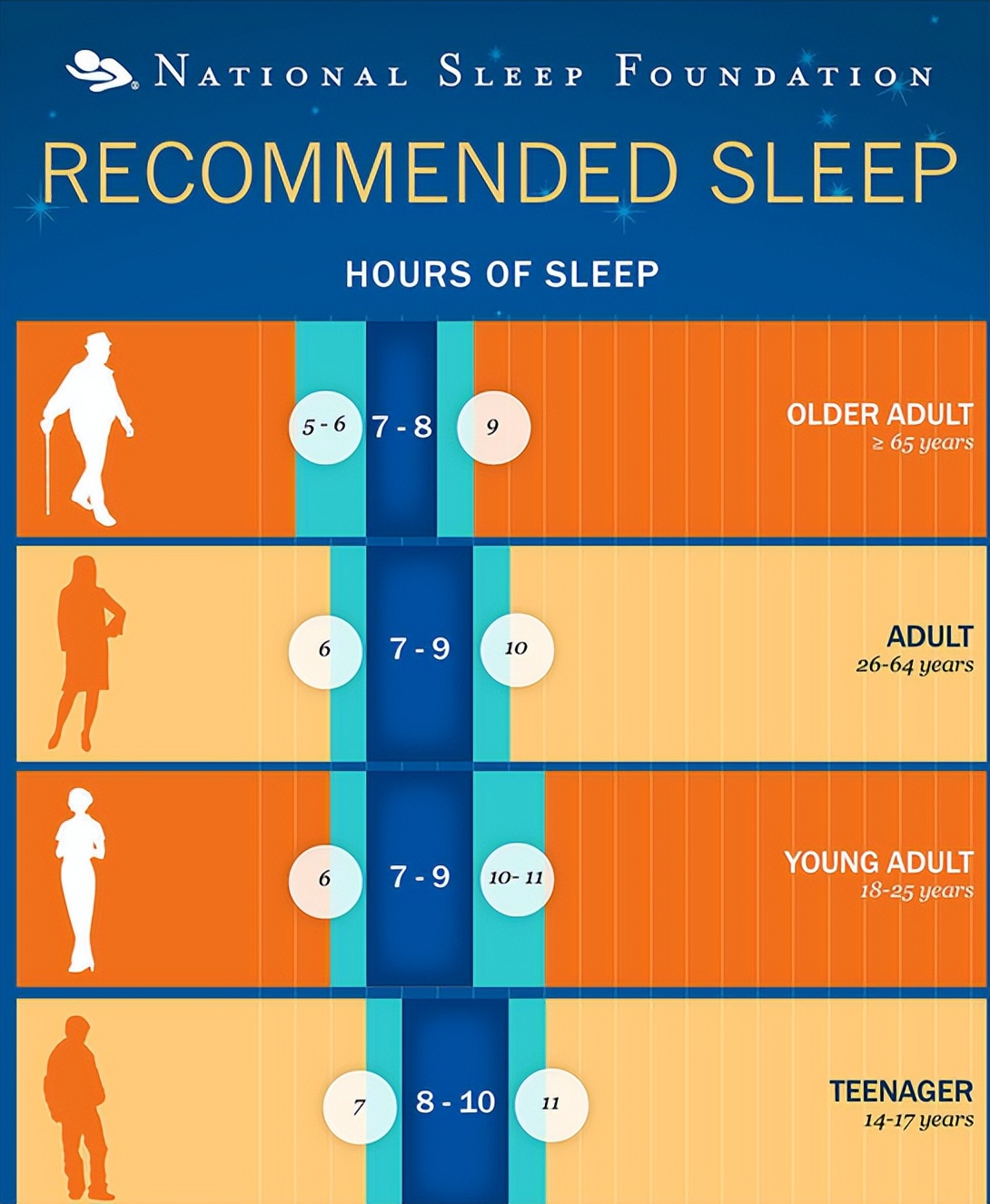 最后,我喜欢下面这张图,是针对总体睡眠的。中间深蓝色代表建议的睡眠时间。浅绿色也是合适的,但是橙色就不合适了。