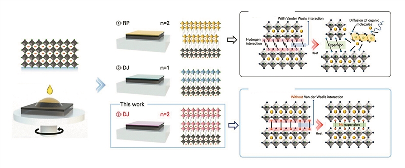在最新研究中,韩国团队利用更稳固的“DJ型2D钙钛矿”作为钝化层,并通过调节热处理条件,实现了对层内钙钛矿堆叠层数与堆叠方式的精确控制。好比砌砖时,通过控制固化温度与时间,让“黏合剂”更紧实、更有序。结果,电荷传输更顺畅,光电转换效率跃升,钝化层结构也愈发坚韧,耐用性大幅增强。