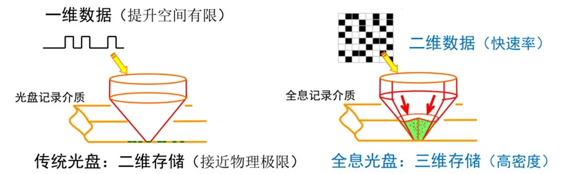传统的存储技术是将一维数据进行二维存储,即将数据以点或线形式记录在物体表面(如机械盘、光盘),而全息存储将信息以二维“页”为单位,记录在存储介质的整个三维体块内部。